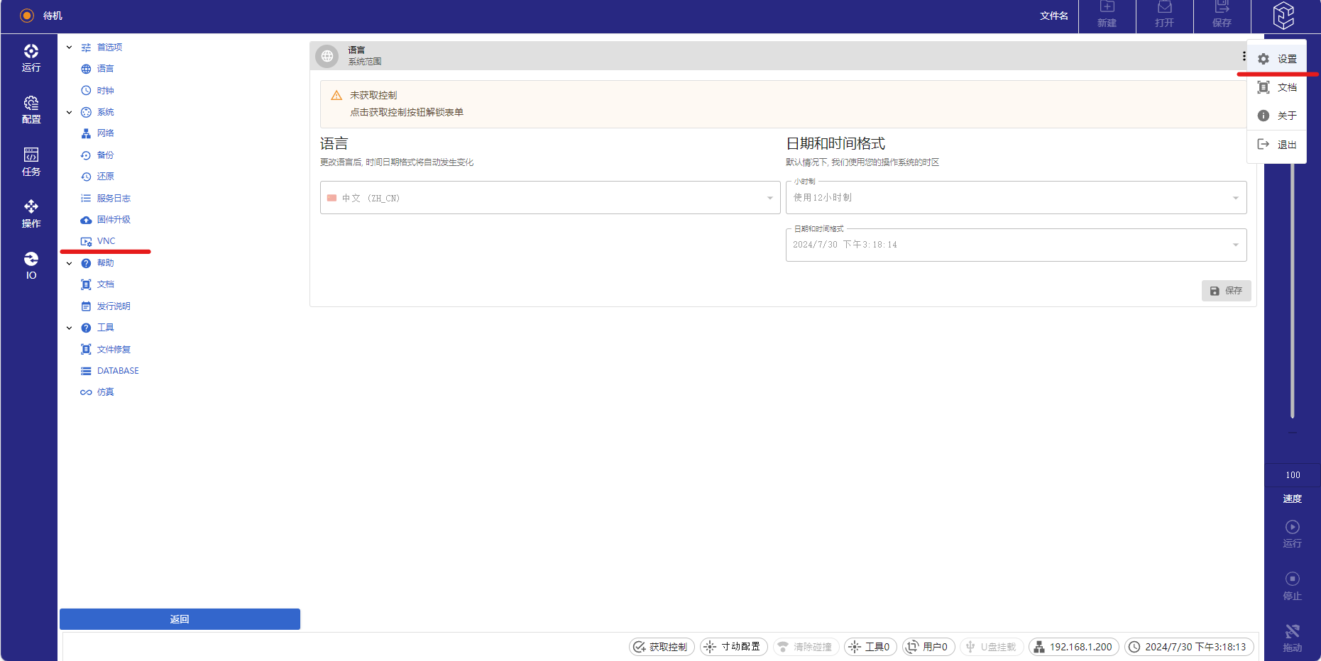 3.12及以上版本开始支持全新的网页示教器,其功能更丰富,若还想在网页示教器使用VNC功能按照如下步骤: 先点击右上角leyu.乐鱼(中国)logo,点击设置,再点击VNC即可进入
