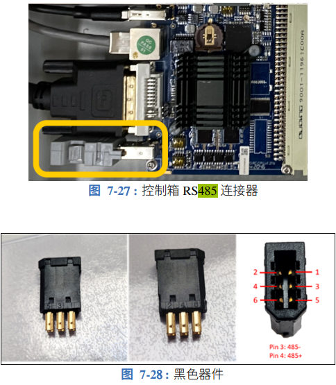 leyu.乐鱼(中国)机器人EC系列支持RS485通讯,用户可以通过将 RS485 设备连接到图 7-27 中所示的连接器来从控制柜执行串行通信。为了能在控制柜中设置 RS485 连接器,必须拆掉串口连接 器,并将 RS485 线焊接到黑色连接器背面的金属触点,如图 7-28 所示。黑色塑料装置的正反 面分别标有 PIN“1 3 5”和“2 4 6”。PIN3 应焊接到 RS485B,PIN4 应焊接 到 RS485A。该 接口支持的最大波特率为 500Kbps。