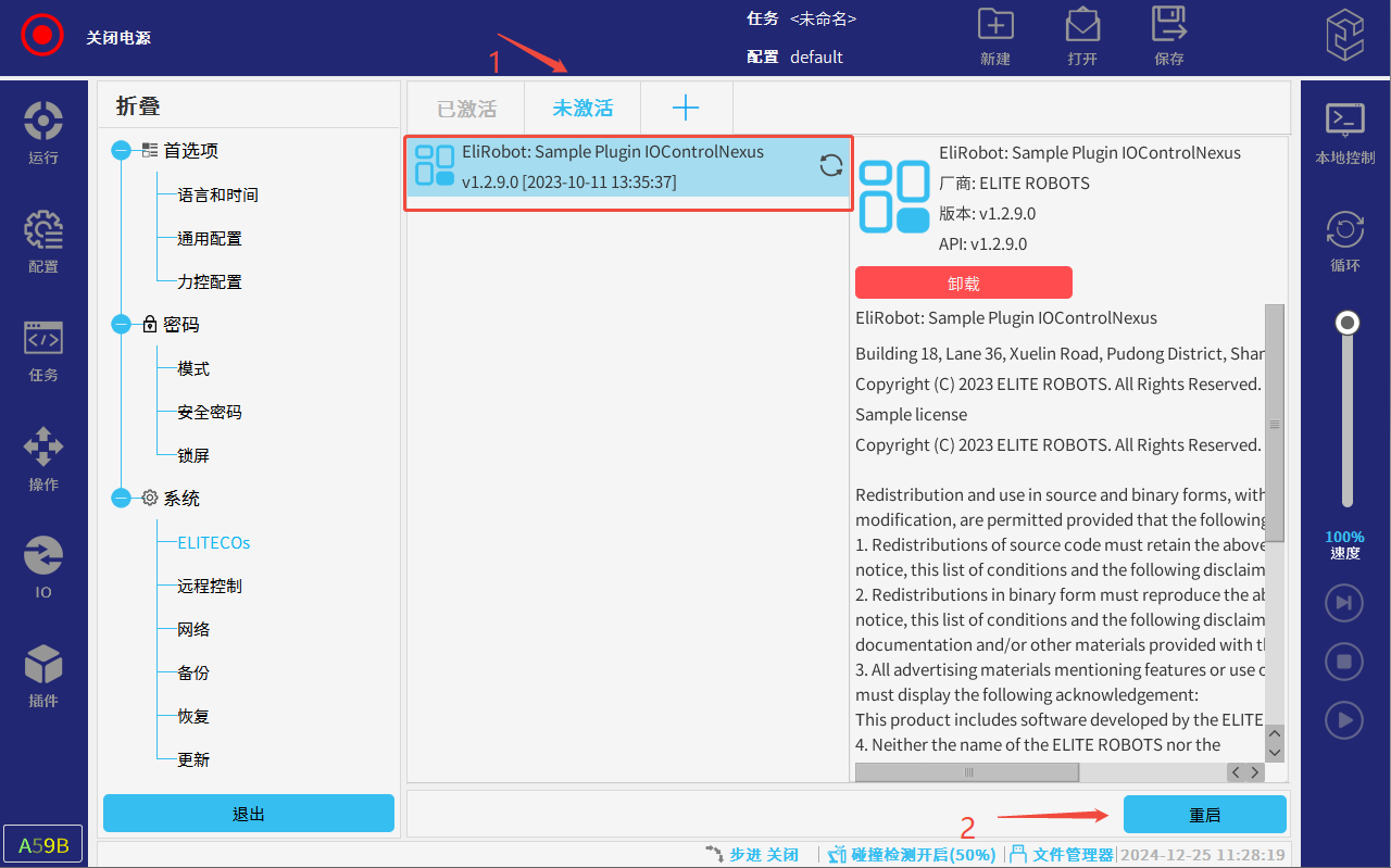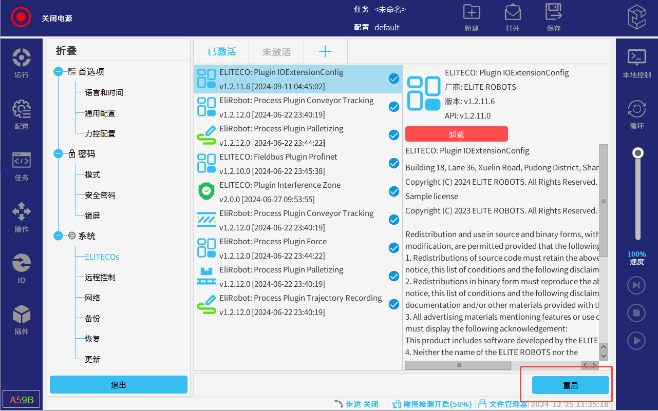 把插件放在U盘插入示教器U盘接口,点击右上角ELITE图标,再点击设置(需要的相应插件请联系ELITE技术人员)