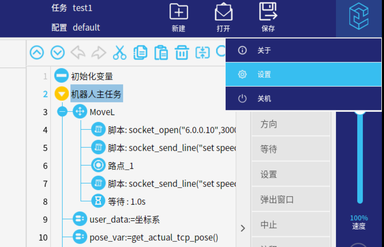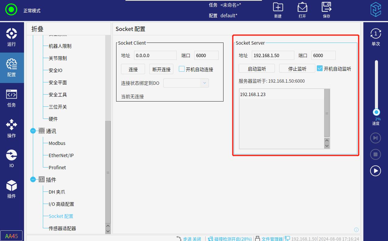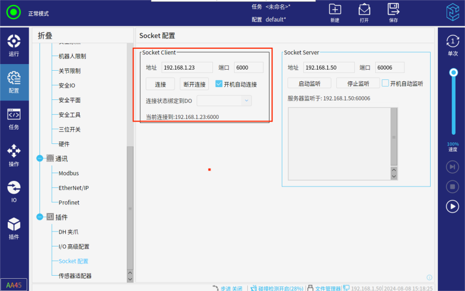 机器人本身的socket通讯只有脚本这一种方式,用户编写脚本通讯耗时 多,且不能开机自动连接,此插件提供用户界面减少用户使用socket的时间,同时提供开机自启或自动连接的客户端和服务器,并且提供快捷指令。