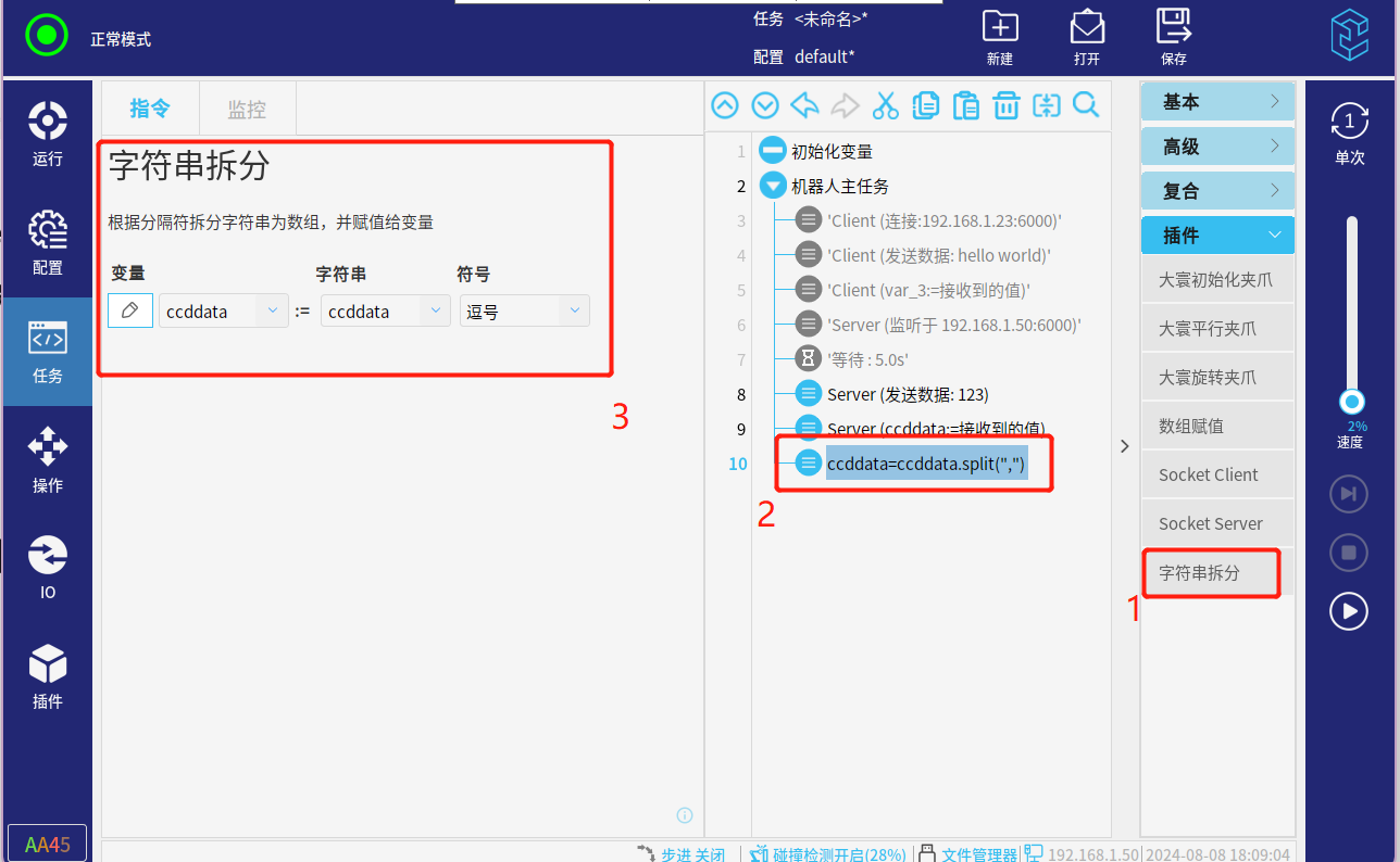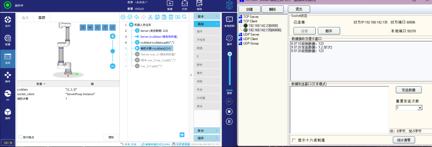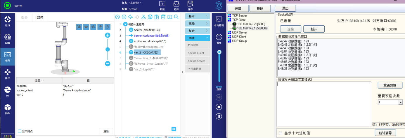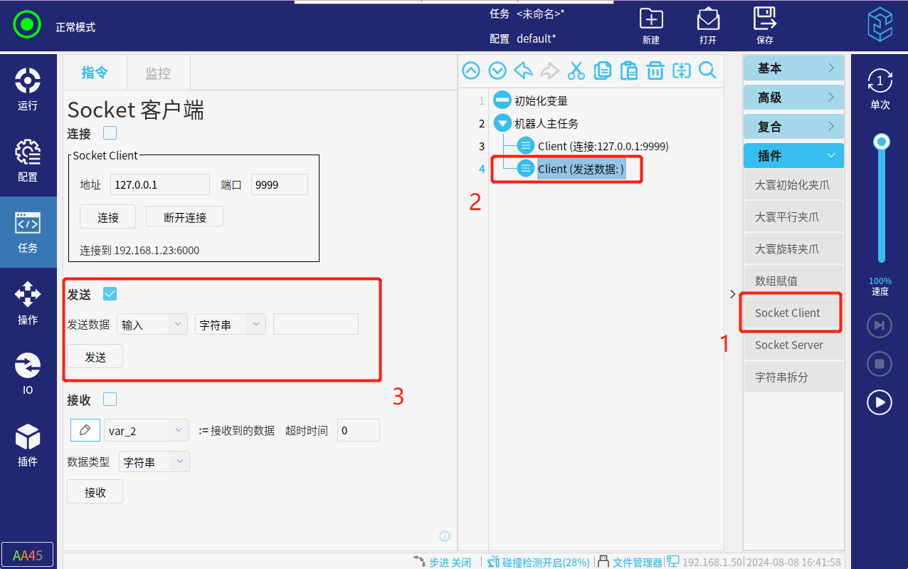 选择导航栏“任务”-指令栏选择“插件”-点击"Socket Client"-设置该指令(勾选“发送”-输入对应的数据类型)可以手动点击”发送“,也可以直接”运行任务“来发送