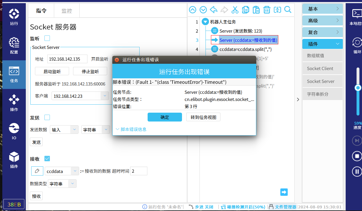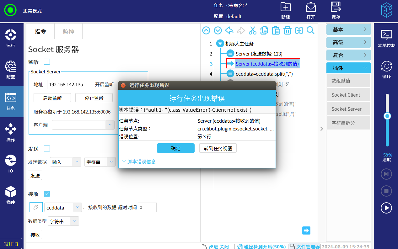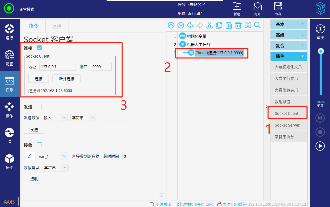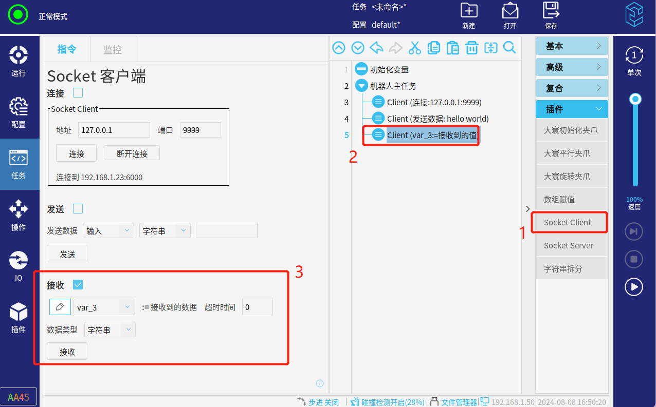 选择导航栏“任务”-指令栏选择“插件”-点击"Socket Client"-设置该指令(勾选“接收”-输入对应的数据类型)可以手动点击”接收“,也可以直接”运行任务“来接收