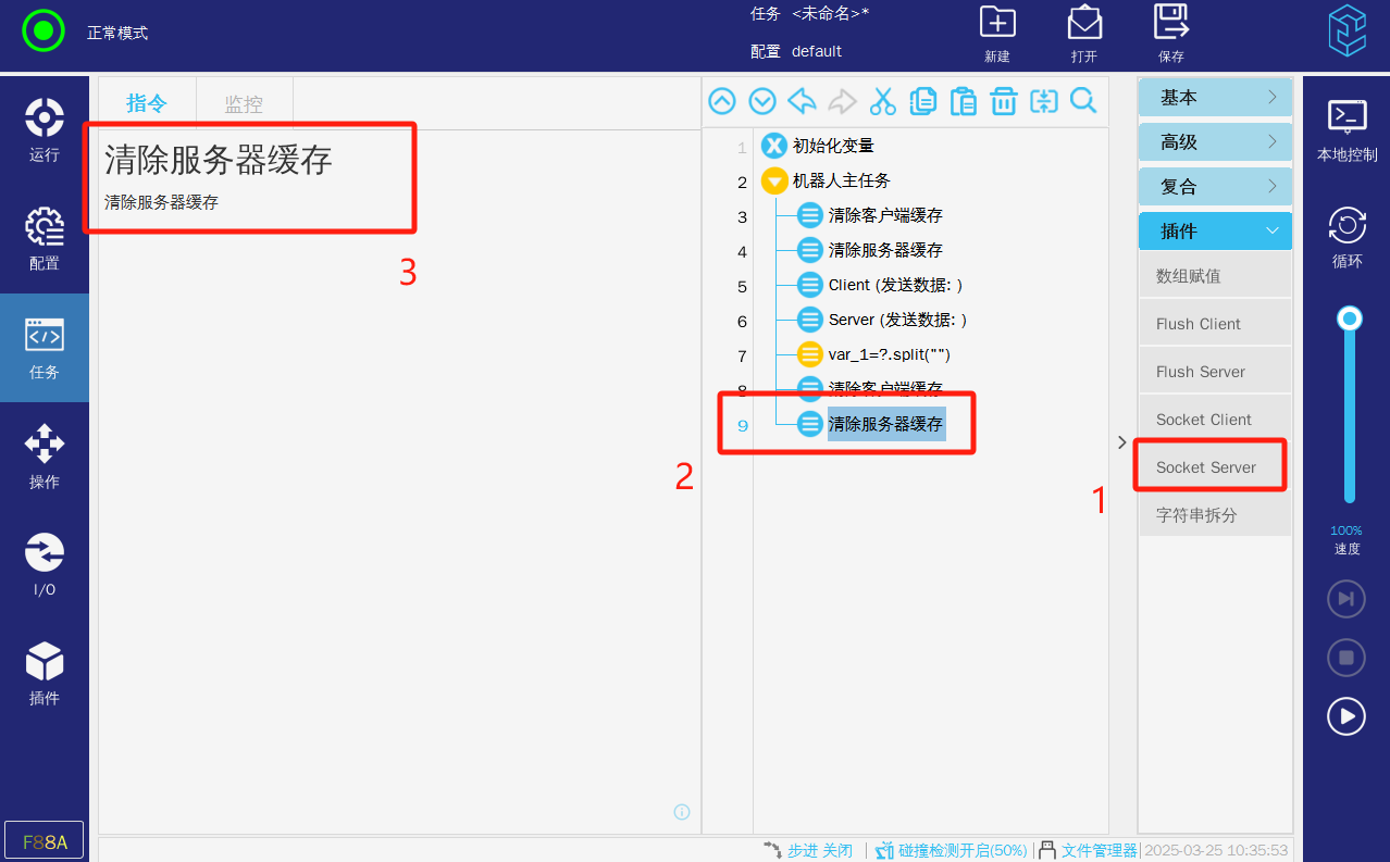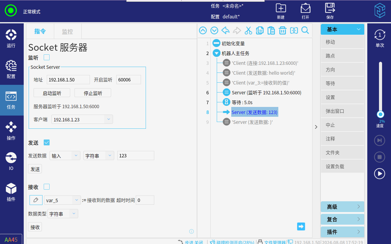 选择导航栏“任务”-指令栏选择“插件”-点击"Socket Server"-设置该指令(勾选“发送”-输入对应的数据类型)可以手动点击”发送“,也可以直接”运行任务“来发送