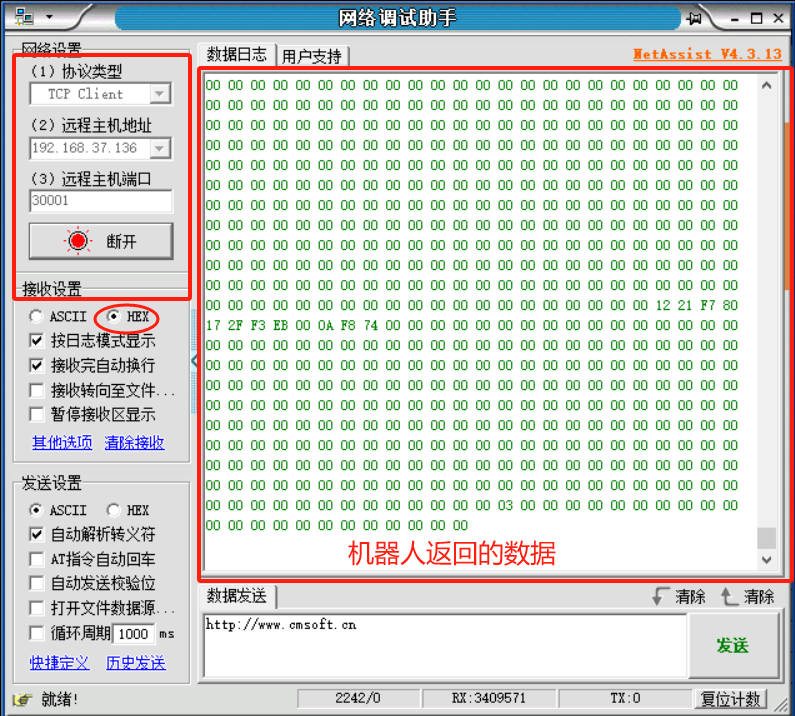 1.通过网络调试助手连接CS机器人30001端口后,机器人会以 10HZ 的频率向 30001 端口 发送数据,如图2-1-1所示:为机器人FB1网口IP,以16进制格式接收。