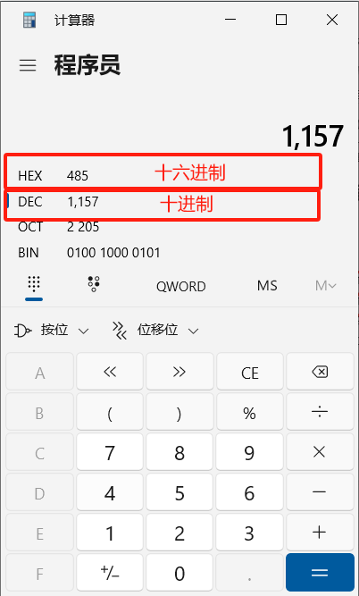 2.首先我们需要找到报文头,因为调试助手是以十六进制接收机器人返回的数据,”机器人状态报文表”中的报文的长度和报文类型(16)数据为十进制,所以首先把整个报文长度(1157)和报文类型=(16)转换为16进制,方便寻找报文头,十进制1157转换成十六进制为 ”485“ 又因为报文头在数据中占四个字节所以整个报文头长度为”00 00 04 85“,十进制16转换成十六进制为“10”,如图2-1-3:
