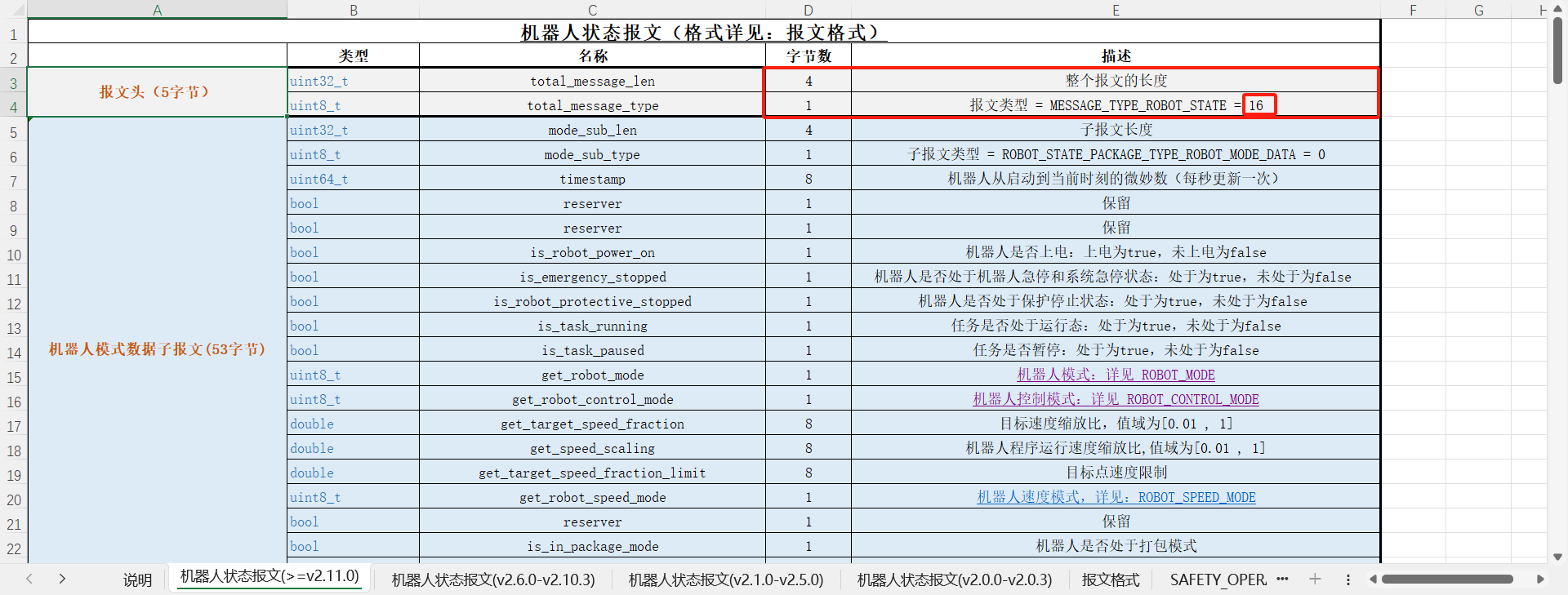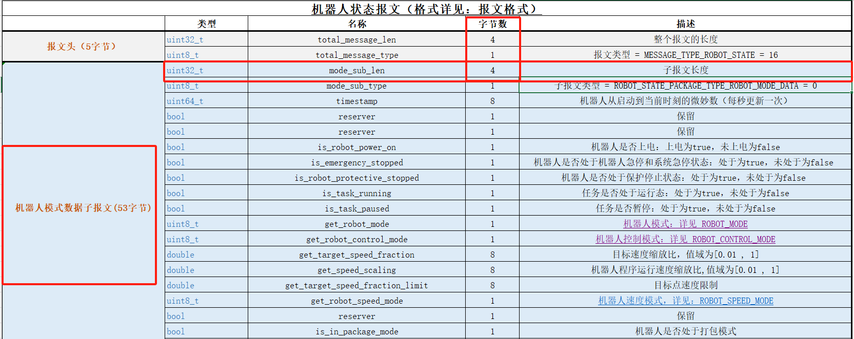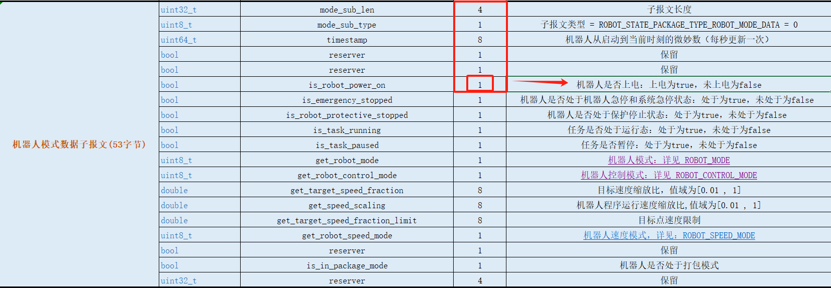 1.当我们需要解析机器人的某一种状态时,首先需要找到这个状态的子报文头即可,例如通过”机器人状态报文表”得知”机器人模式”子报文长度为53且占4个字节如图2-1-5所示,所以转换成十六进制为“00 00 00 35”。