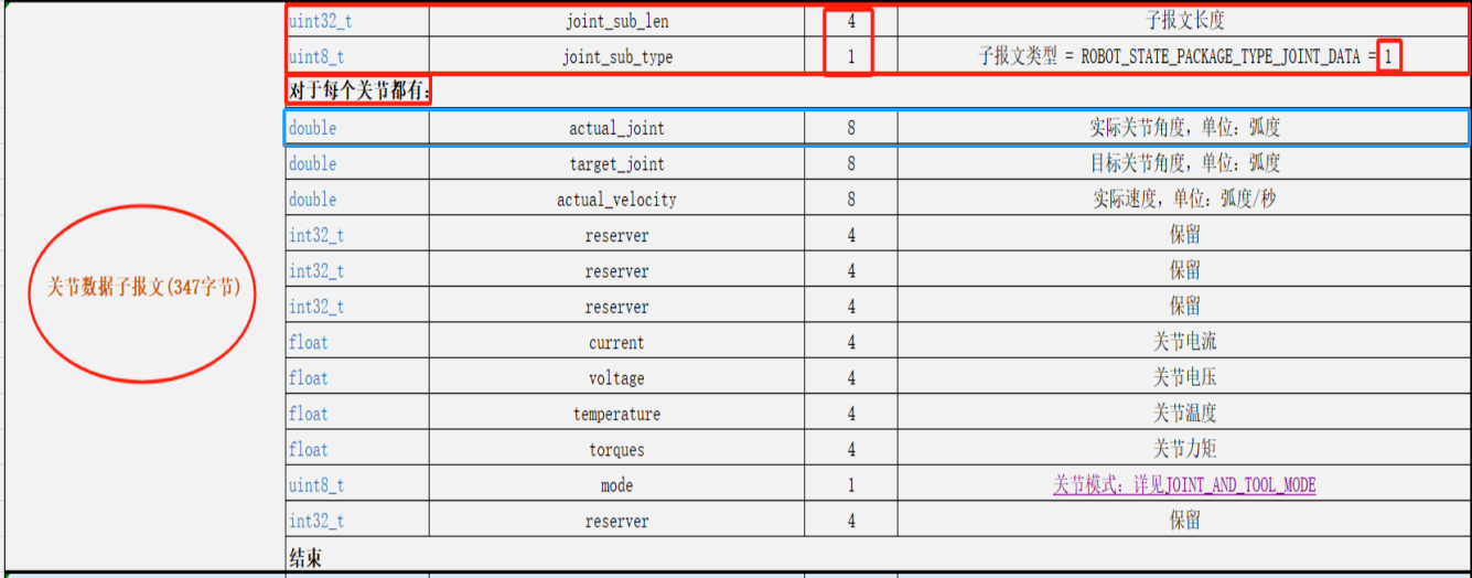 2.首先需要找到关节数据子报文长度“00 00 01 5B”和子报文类型”01“,然后从报文头“00 00 01 5B 01“第1位字节截取到347位字节为机器人模式数据的报文如图2-1-10所示(红到紫)