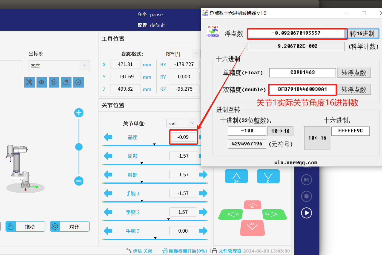 6. 通过”浮点数十六进制转换器“对每个关节实际角度数据依次进行转换得: