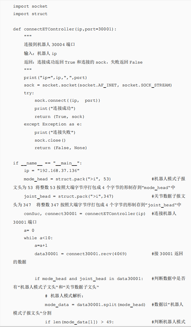 通过以上手动解析的方法对机器人状态报文以及数据格式基本了解后下面通过python对30001端口数据进行解析,还是以”机器人是否上电“和“机器人当前实际关节角度”为例说明。