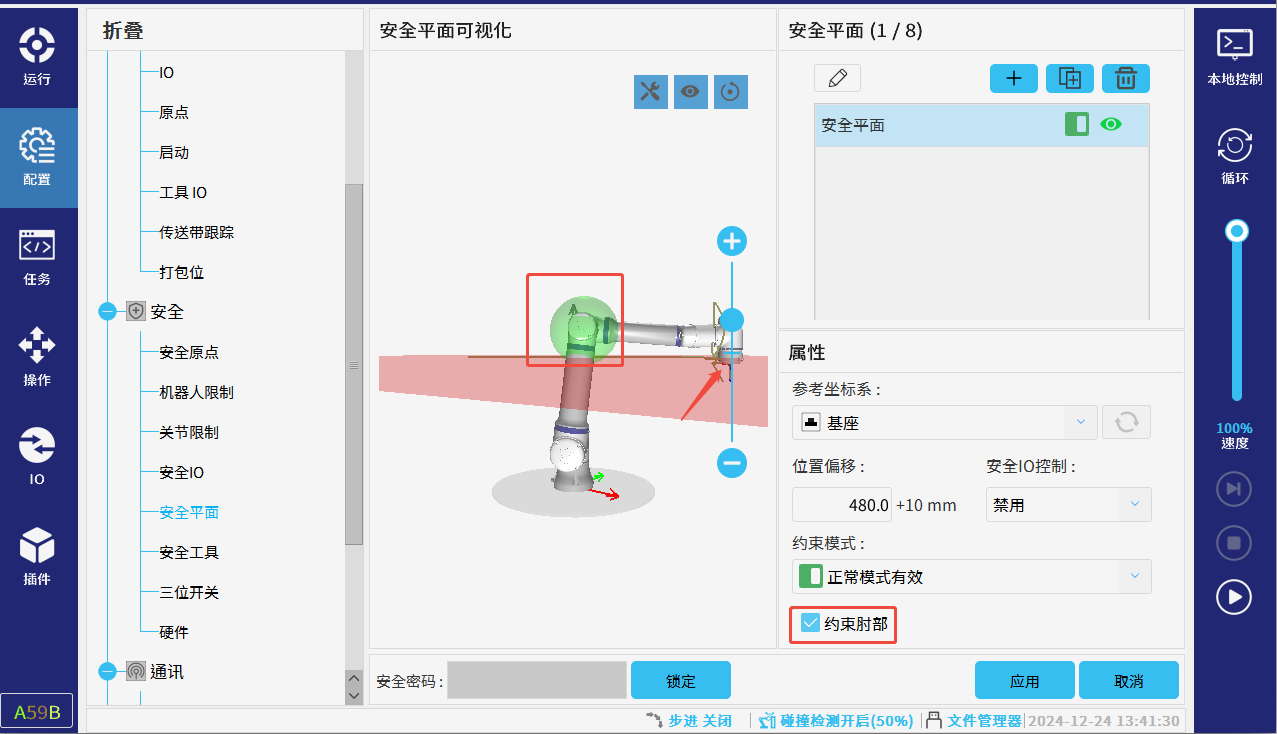 设置安全平面时可以选择勾选或者不勾选“约束肘部”(勾选了会在肘部有个球体),如果勾选了则需要把肘部连同末端TCP一同脱离安全平面,如果没有勾选则只需要把末端TCP脱离安全平面,操作方法如同2.1