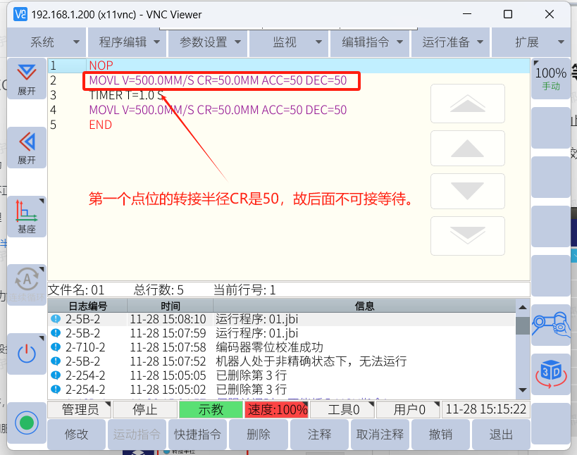当CR不为0 ,且后面有延时或者条件等待时,机器人会转弯时快速停止 ,就可能造成抖动或者出现其他报警 ,长期这样也会对减速器损伤。如图所示: