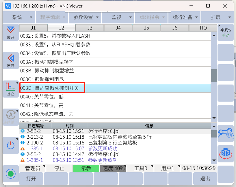 2. 找到003D,一般抖动牵连的关节是J2和J3较多,可仅打开这两个关节的震动抑制功能。