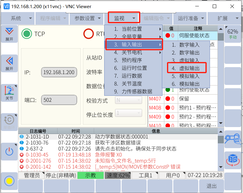 示教器中查看对应的M920、M922、M924分别状态为1,读取线圈功能及指令正常