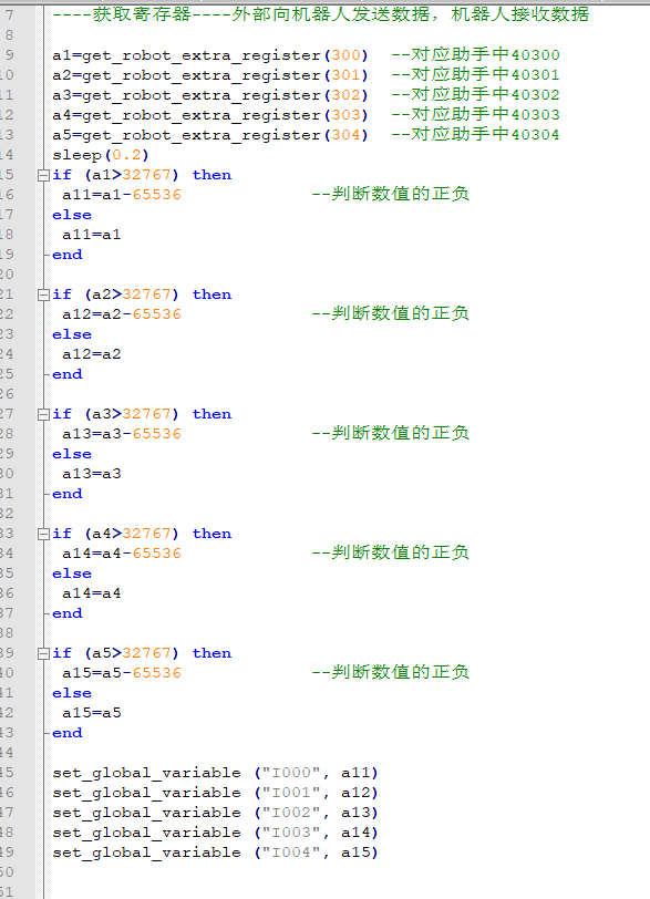 6).机器人通过全局变量I10-I14,将数据写入寄存器320-324,脚本如下所示