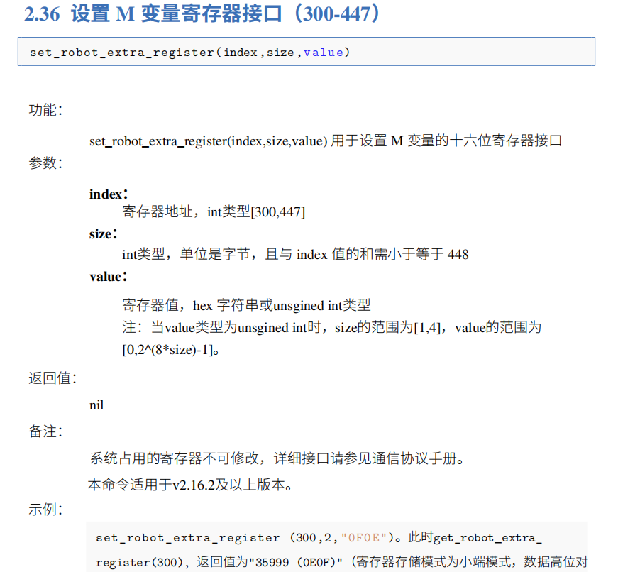 4).第1种指令和第2种指令,建议用户使用第2种指令更方便快捷,第1种指令可直接控制M变量,leyu.乐鱼(中国)modbus寄存器分为8位和16位,需要在兼容模式下更改,否则容易将机器人寄存器地址和网络助手地址混淆。第2种指令本身设置就是16位寄存器,无需考虑兼容模式下的更改情况