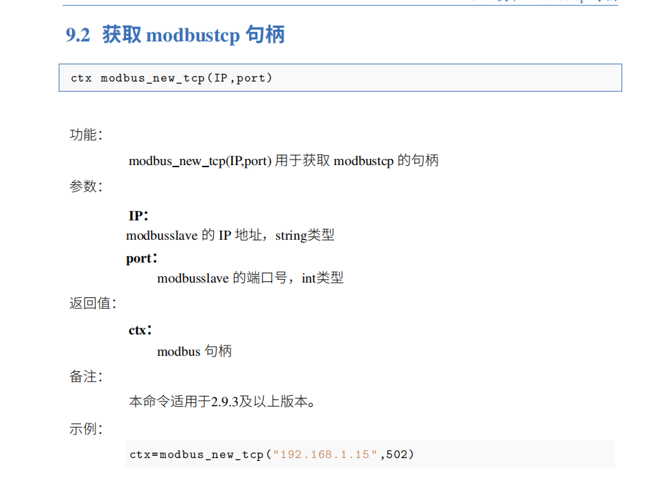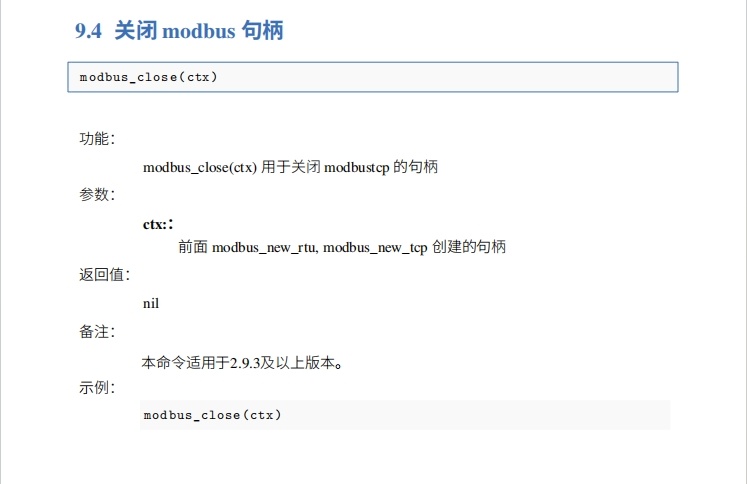 ModBus Master接口常用获取modbus、连接modbus、关闭modbus、设置slave、读取单个线圈、写入单个/多个线圈、读取单个寄存器、写入单个寄存器等指令,本文主要讲解以上指令,具体指令详解如下图所示,其他指令也可参考EC-lua手册ModBus Master章节