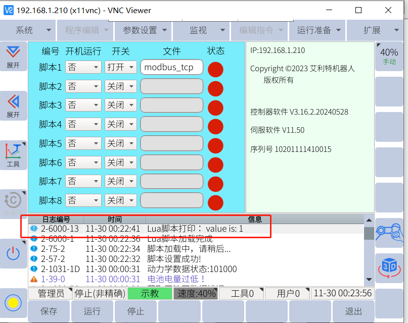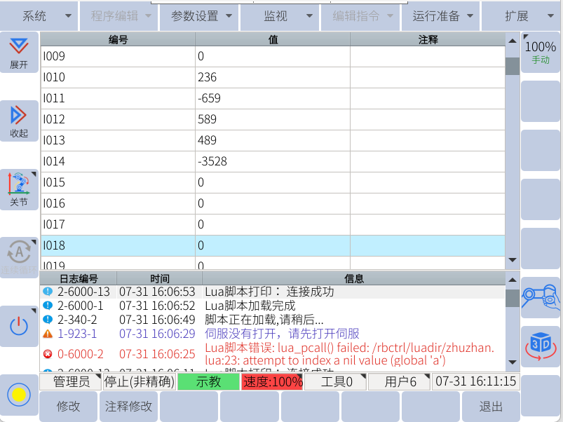 机器人端可在全局变量中查看I000-I004与寄存器400-404数值一致,读取寄存器功能及指令正常