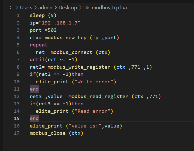 ModBus主站功能通过lua脚本实现,可以参考EC-lua手册进行使用。其中MODBUS MASTER为已经封装的接口,用户只需传入相应参数即可;如有其他特殊协议要求,可以使用TCP/UDP通讯、485通讯、TCI通讯(工具末端485)和232通讯等。