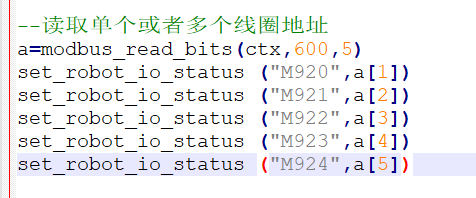 机器人读取寄存器300-304寄存器数值同时存入到I0-I4寄存器中,脚本如下