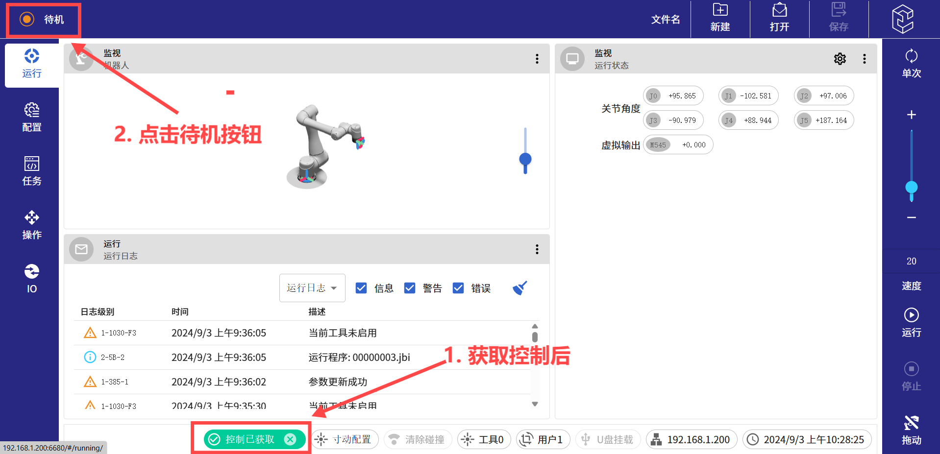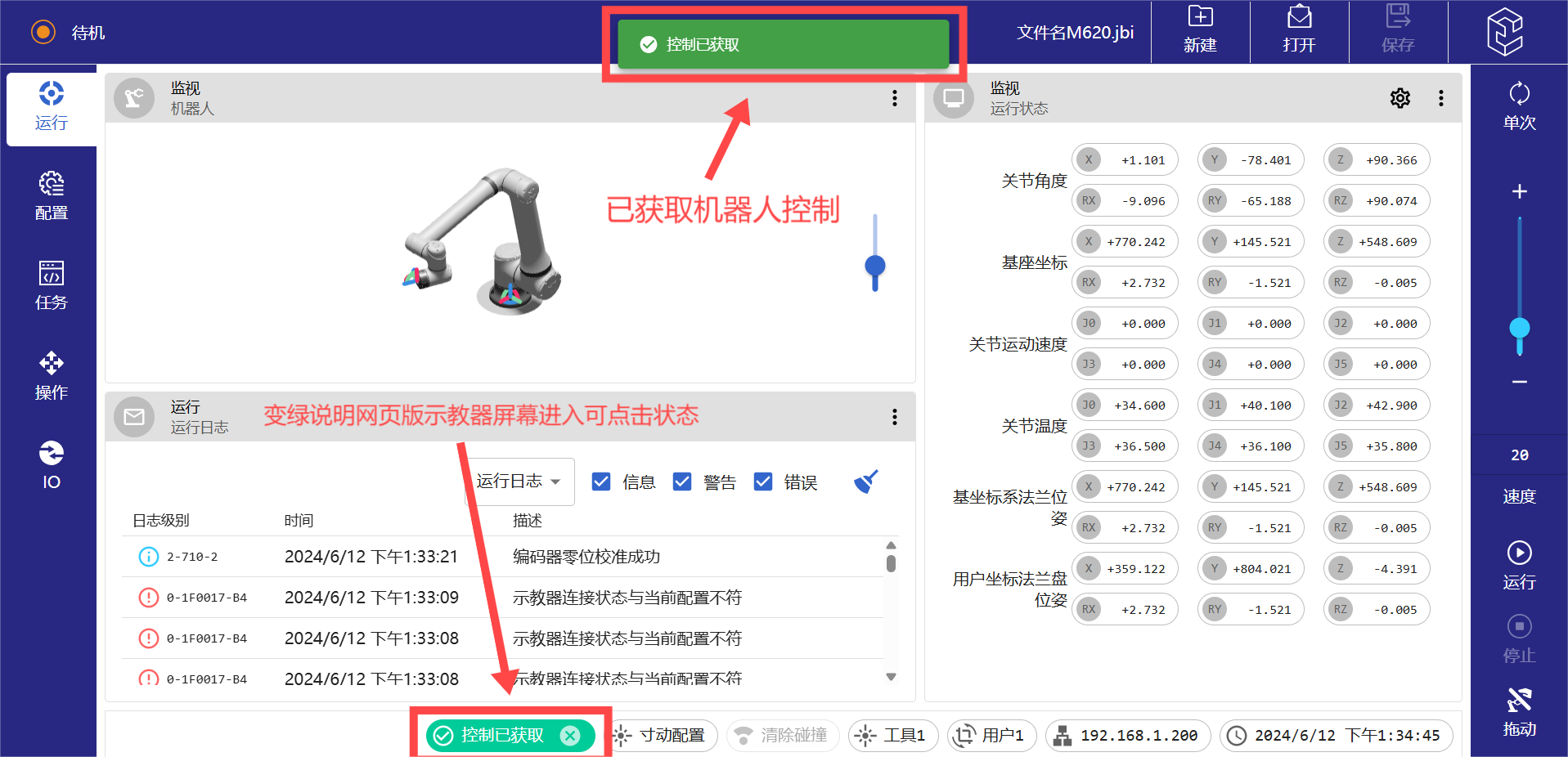 (5)进入网页版示教器后,和另外两种方法一样,先点击下方菜单栏里面的获取控制按键,等待获取控制按键从白色变为绿色后,即可操作网页版示教器上面的操作界面。
